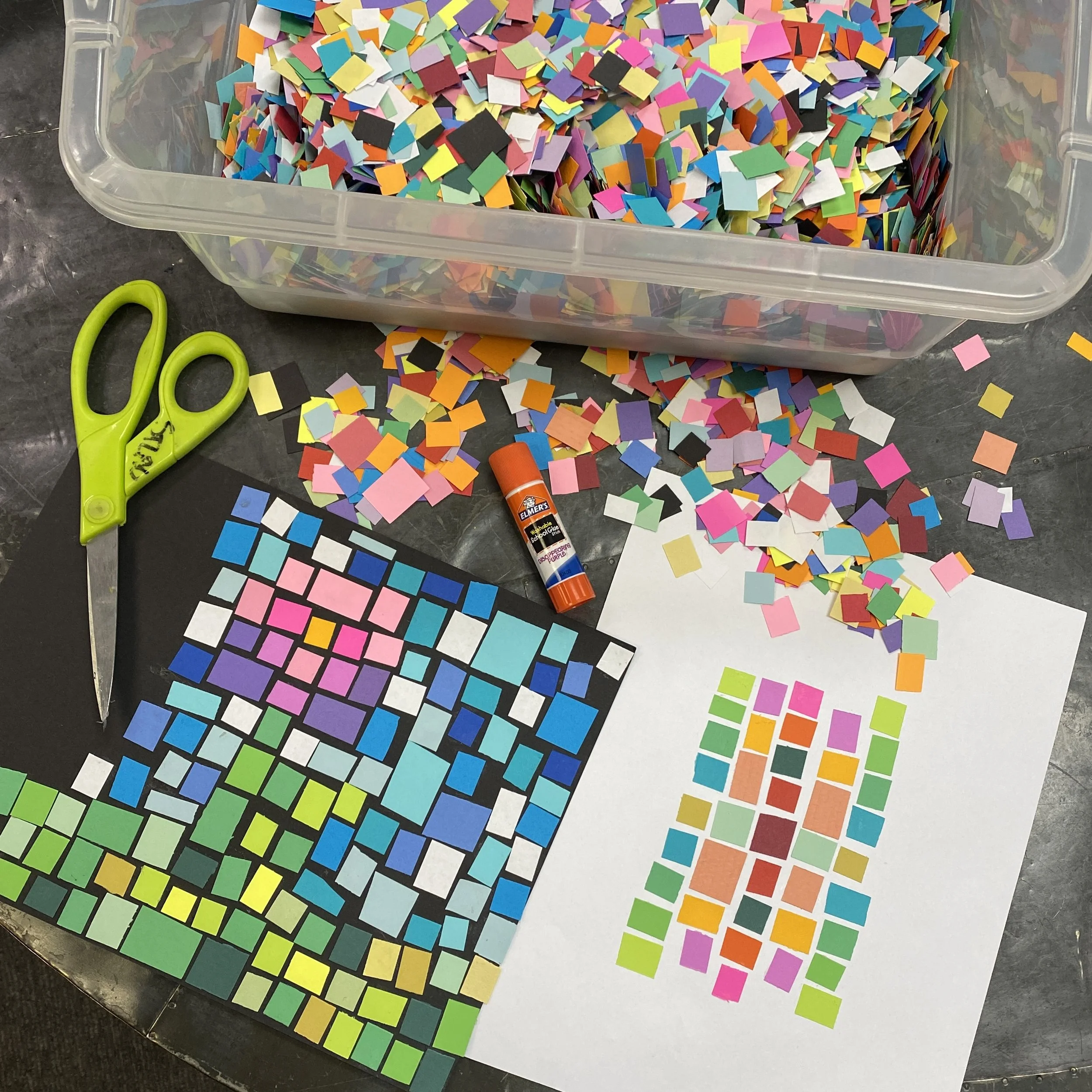 Paper Mosaics- Piles of paper pieces will be our material this month! Create mosaics of any shape using small squares and rectangles. Our mosaics can be random and abstract, repetitive patterns, or make pictures!